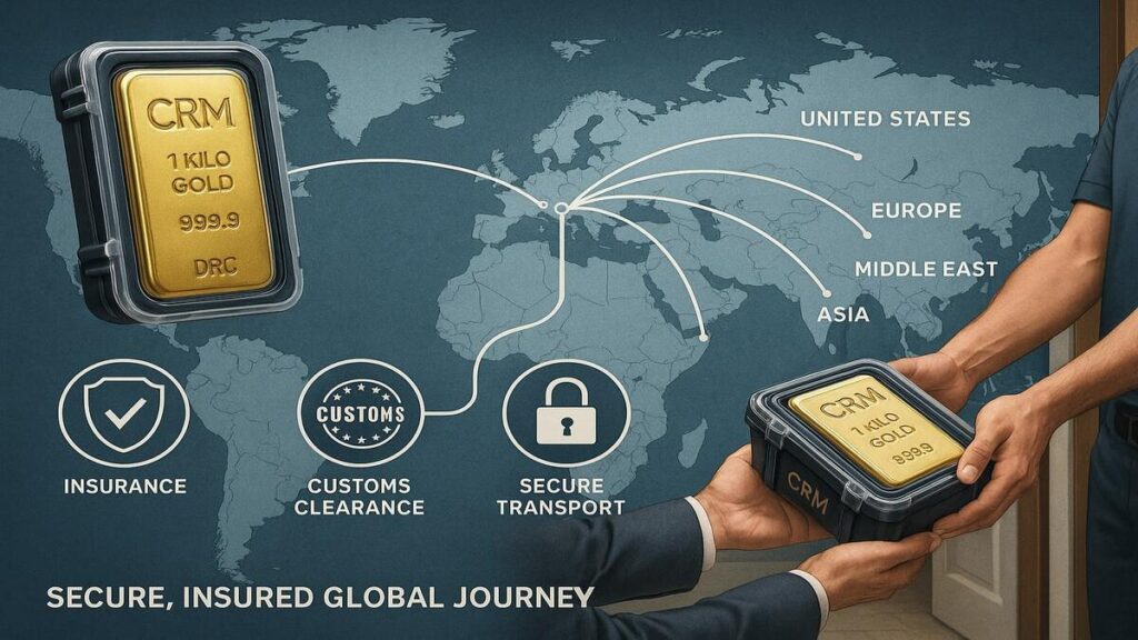 For global buyers in the U.S., Europe, Asia, or the Middle East, insured gold bar delivery is essential. At Congo Rare Minerals (CRM), we specialize in international gold shipping, customs clearance, and full-value insurance – ensuring your wealth is protected from mine to vault to your hands.
